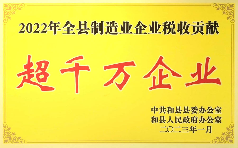 为弘扬先进、树立典型,和县县委、县政府决定对2022年度全县制造业企业税收贡献超千万元企业进行表彰,并在会上进行了通报,华球体育·(中国)官方网站公司荣获“2022年度全县制造业企业税收贡献超千万元企业”荣誉称号。